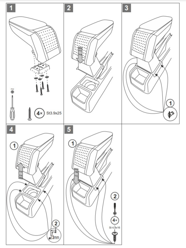 NOTE: The car in the assembly video and the armrest in the pictures is an example. The mounting console/adapter of the armrest obviously differs per car model, the support itself is identical to the picture. The mounting method also remains the same. You will receive the specific custom mounting bracket for your car model.